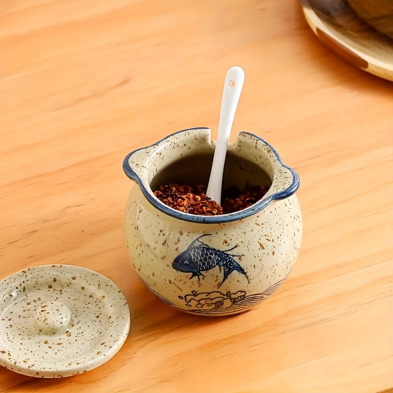 1pc Cute Ceramic Spice Jar with Lid & Spoon, Seasoning Jar, Seasoning Bottle, Spice Box for Spices Salt Sugar