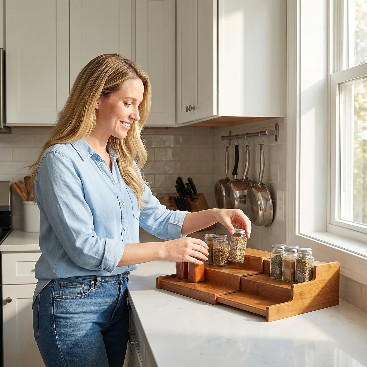 3-Tier Bamboo Spice Rack Organizer for Cabinet & Pantry - Adjustable Shelves, Under\u002FCountertop Spice Shelf with Bamboo Wood Storage - Space-Saving Vertical Spice Jars\u002FContainers Holder, Expandable Kitchen Spice Organization System